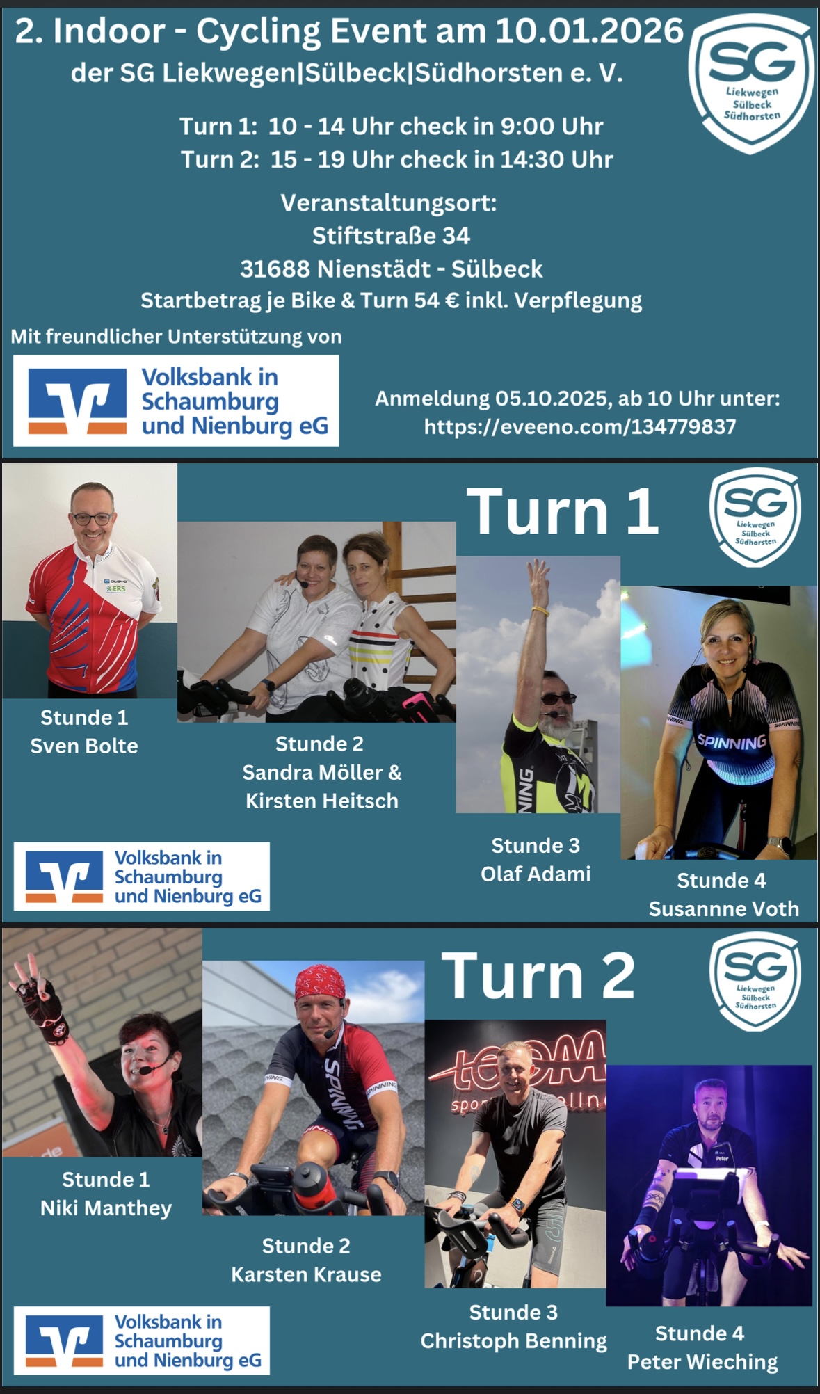 Nach dem positiven Feedback der ersten Auflage, haben sich der Verein und das Organisationsteam zu der zweiten Auflage des Events entschieden. Bereits 7 Minuten nach Beginn der Anmeldung im Oktober war das Event mit seinen 80 Startplätzen voll ausgebucht. Die sehr hohe Anfrage auf die Tickets spiegelt sich in der Warteliste von über 50 Cycling-Begeisterten wider. Die Teilnehmer kommen nicht nur aus der regionalen Umgebung, sondern aus dem gesamten Bundesgebiet. In mehreren Gesprächen kamen die Cycling-Freunde immer wieder auf die sehr familiärere, gemütliche Atmosphäre, die der Verein mit seinem Vereinsheim bietet. Wie in der ersten Auflage, setzt man auf ein bewährtes Konzept und fährt in 2 Turns á 50 Minuten mit jeweils 10 Minuten Pause dazwischen. Los geht es mit dem ersten Turn von 10 Uhr bis 14 Uhr, eine Stunde Pause und danach folgt Turn 2 von 15 Uhr – 19 Uhr. Neu hinzu kommt dieses Mal ein Drummer, der einzelne Lieder in den Stunden mit seinem Schlagzeug begleitet. Die Instruktoren sind bunt gemischt und in der Cycling Szene bekannt.
